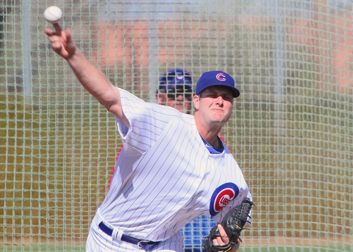 An early day for the players started with the annual photo shoot at 7am, as is custom they wore the home white pinstripes. Highlights of the day included a Brett Jackson and Anthony Rizzo bomb hitting contest during BP in which Rizzo trumped Jackson with a monster blast over the 50 foot high green wall in dead center. Starlin Castro was hit in the arm by a Kerry Wood pitch but only a glancing blow, nothing serious – thank goodness. The guys finished up the day with another round of the bunting tournament wherein Manager Dale Sveum knocked Kerry Wood out of the competition.