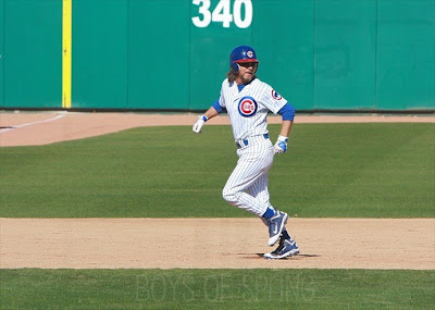 Ernie Banks is said to have inspired long-time Cubs fan Eddie Vedder to write his Cubs ode ‘All The Way’. Vedder was at the Randy Hundley Cubs fantasy camp all week here in Mesa and played in Saturday’s big game at Hohokam Park. I overheard Bobby Dernier in the on-deck circle saying he was going to hit one out to Vedder in centerfield, but Bobby ended up pulling it to left instead. It was also nice to see the #10 Santo jersey on the field as Ron’s son’s, Jeff and Ron Jr. participated in the camp. Below are some pics I took after Eddie hit an RBI single.